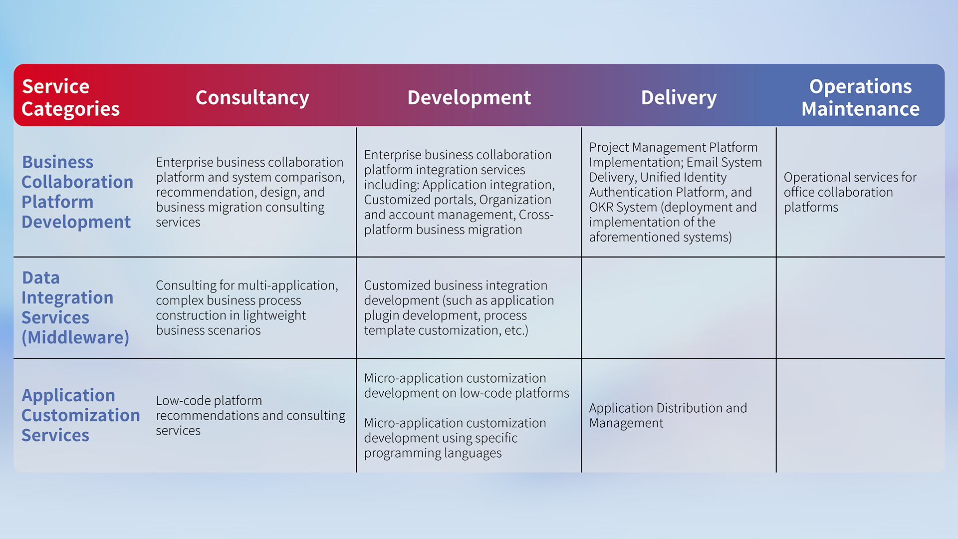 Provide planning, solutions, delivery, and customized development services for platform-level products such as DingTalk, WeChat Work, and IDaas, to achieve business scenarios such as unified collaborative office, intelligent customer service, hybrid meeting management, intelligent data query, and realize digital transformation.