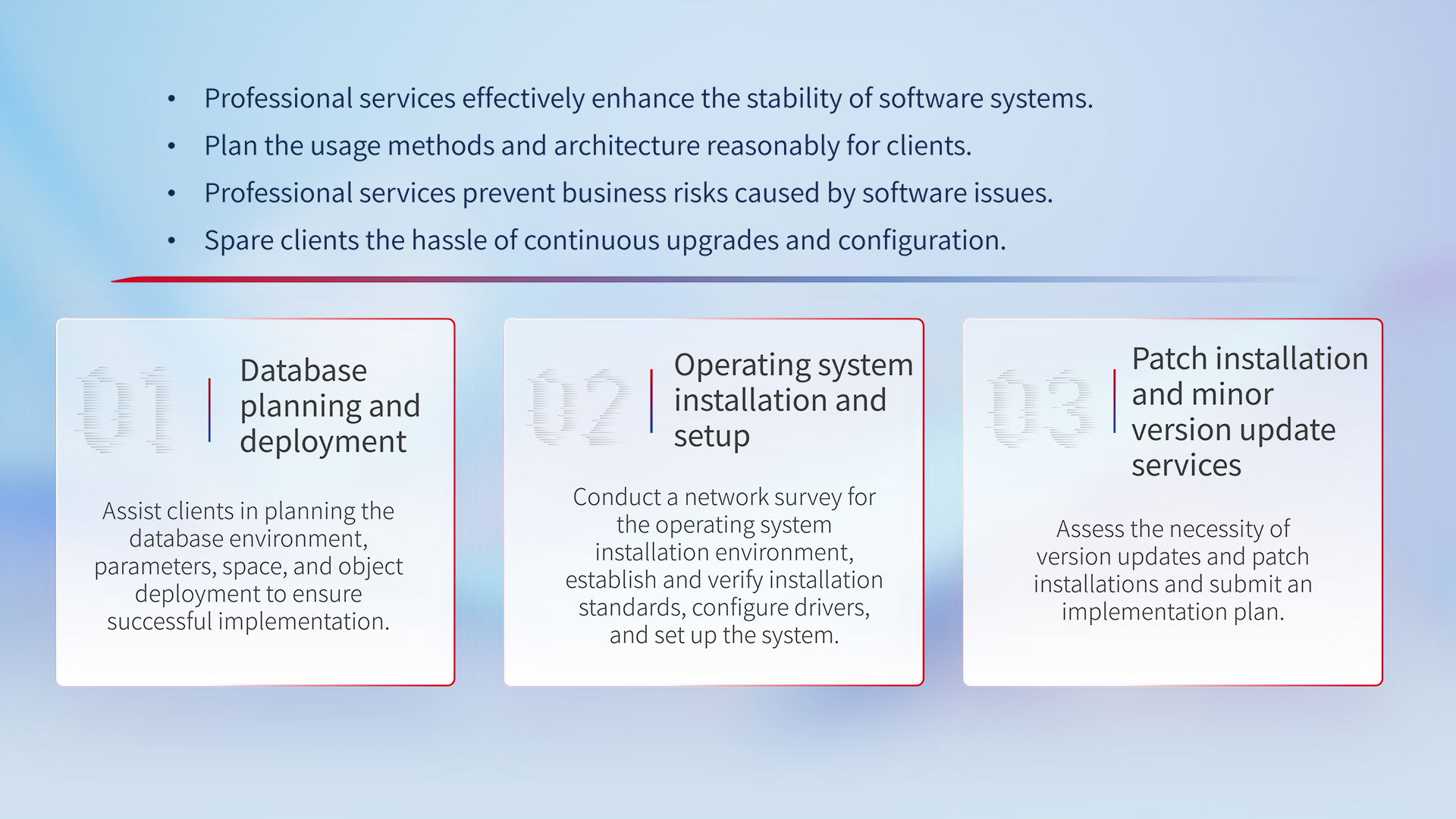 We provide professional services for customers' software scale-up, rapid deployment, and on-demand configuration, from database planning and deployment to operating system installation and setup, and then to patch installation and minor version upgrades.
