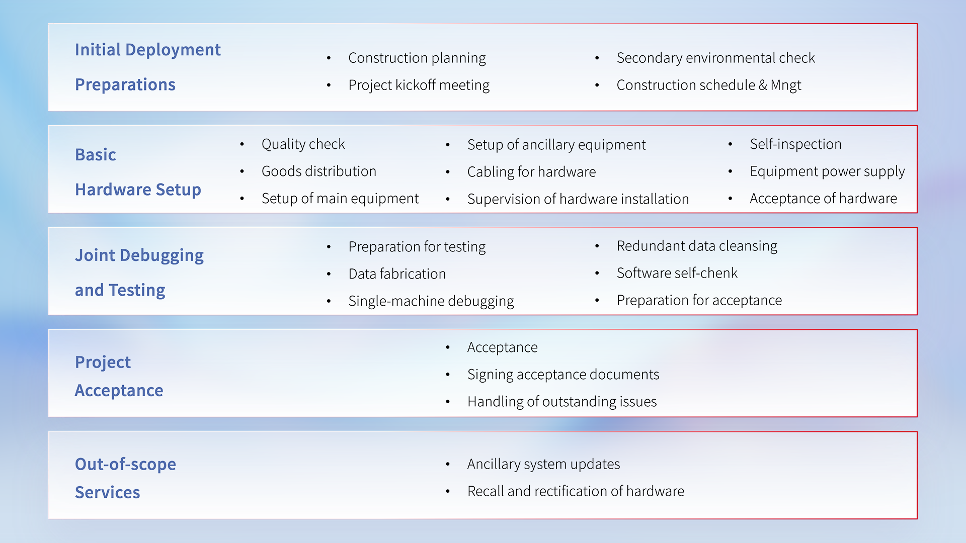 From basic deployment preparation, basic hardware deployment, joint debugging and testing, project acceptance, to cross-interface activities, the entire process is traceable, ensuring the quality and progress of construction.