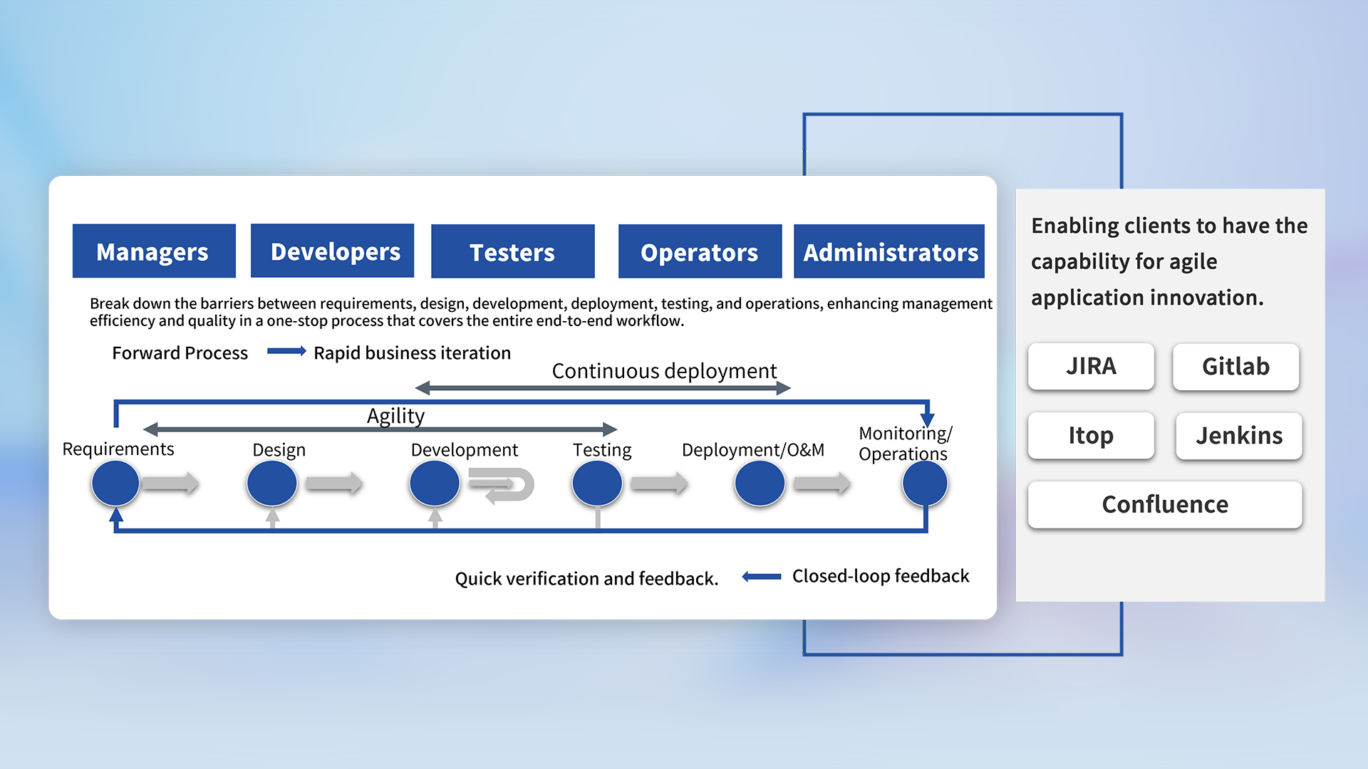 Based on cloud-native technical methodologies, Digital China constructs a new development, delivery, and operation and maintenance model for you, allowing applications to take root and grow in the cloud, and helping your business achieve efficient, stable, and secure operation in the cloud.