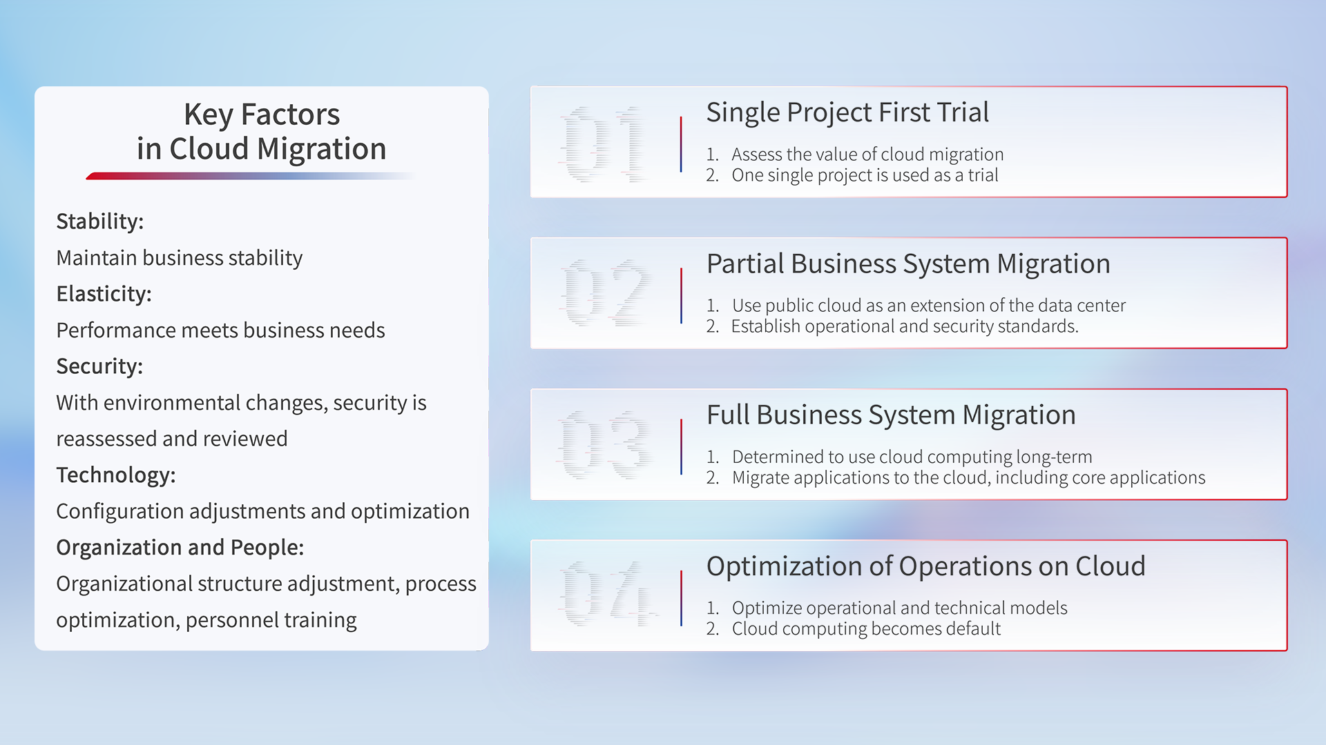 Combining real business needs, we guide customers through the entire migration process—from planning and design, cloud platform selection, cloud-native transformation, data migration, to integrated delivery—identifying the best cloud paths, managing risks, and designing network architectures, identity permissions, security audits, operational audits, log audits, monitoring and alert policies, and multi-site disaster recovery. This comprehensive planning of cloud infrastructure enhances IT governance to meet the demands for elasticity, high availability, and high performance.